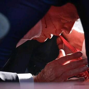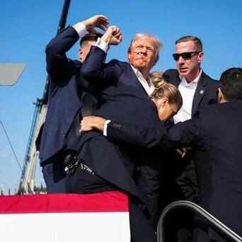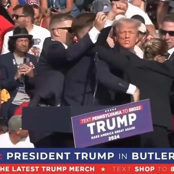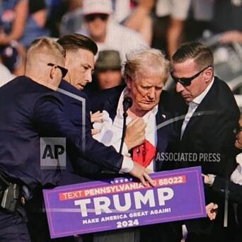 宾夕法尼亚州巴特勒市,前总统特朗普参加本次大选的集会上,突然3声枪响,接着是特朗普捂着耳朵倒地,这是对特朗普的行刺枪击。特勤局保镖涌上来护住特朗普。接着是噼噼啪啪一阵密集的枪响,枪手被击毙。另外一名观众死亡。